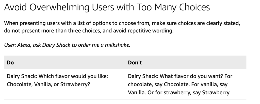 - Assume errors – Algorithms are, by definition, deterministic so there will always be some sort of issue or error that will come up with edge cases. It could be due to crosstalk (smart speakers struggle to identify which speaker is which without training) or ambient background noise. No matter what the cause, users don’t care (and they hate being labeled an edge case) so when you design for a voice experience, consider edge cases or errors because while they won’t happen often, they will stick in the end user’s memory. The timers on my Alexa work 80% of the time, but me and my wife still complain that the “timers never work”.